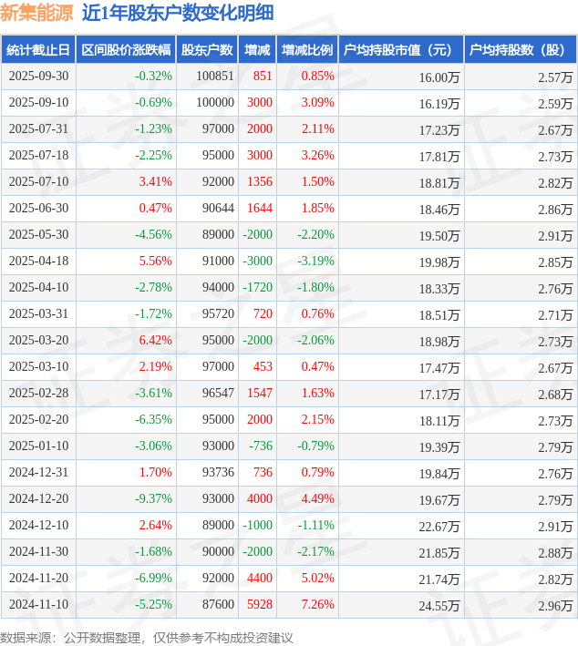 从股价来看,2025年9月10日至2025年9月30日,新集能源区间跌幅为0.32%,在此期间股东户数增加851.0户,增幅为0.85%。