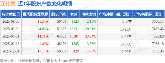 从股价来看,2025年6月30日至2025年9月30日,江化微区间涨幅为11.54%,在此期间股东户数减少1123.0户,减幅为2.18%。