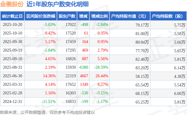 从股价来看,2025年10月10日至2025年10月20日,金徽股份区间跌幅为5.03%,在此期间股东户数减少498.0户,减幅为2.84%。