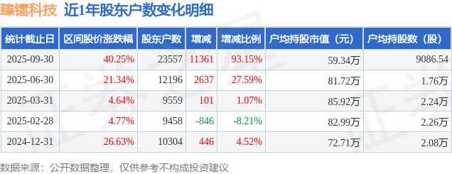 证券之星消息,近日臻镭科技披露,截至2025年9月30日公司股东户数为2.36万户,较6月30日增加1.14万户,增幅为93.15%。户均持股数量由上期的1.76万股减少至9087.0股,户均持股市值为59.34万元。