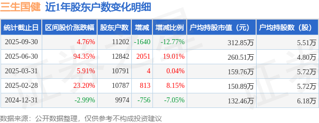 从股价来看,2025年6月30日至2025年9月30日,三生国健区间涨幅为4.76%,在此期间股东户数减少1640.0户,减幅为12.77%。