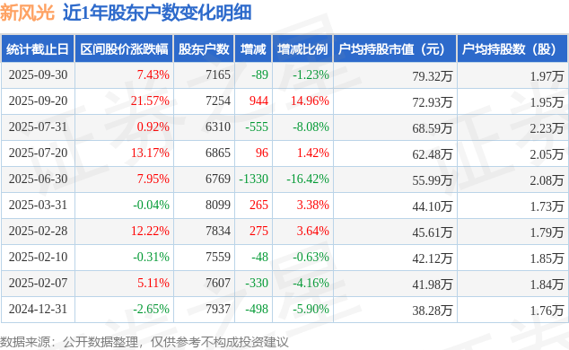 从股价来看,2025年9月20日至2025年9月30日,新风光区间涨幅为7.43%,在此期间股东户数减少89.0户,减幅为1.23%。