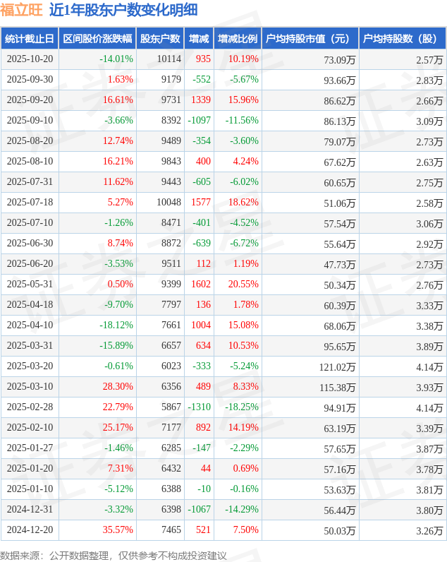 证券之星消息,近日福立旺披露,截至2025年10月20日公司股东户数为1.01万户,较9月30日增加935.0户,增幅为10.19%。户均持股数量由上期的2.83万股减少至2.57万股,户均持股市值为73.09万元。