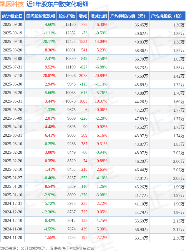 从股价来看,2025年9月19日至2025年9月30日,凯因科技区间跌幅为4.6%,在此期间股东户数增加778.0户,增幅为6.3%。