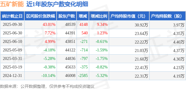 从股价来看,2025年6月30日至2025年9月30日,五矿新能区间涨幅为43.01%,在此期间股东户数增加4148.0户,增幅为9.34%。