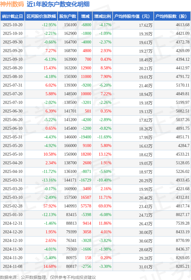 从股价来看,2025年10月10日至2025年10月20日,神州数码区间跌幅为12.95%,在此期间股东户数减少6800.0户,减幅为4.17%。
