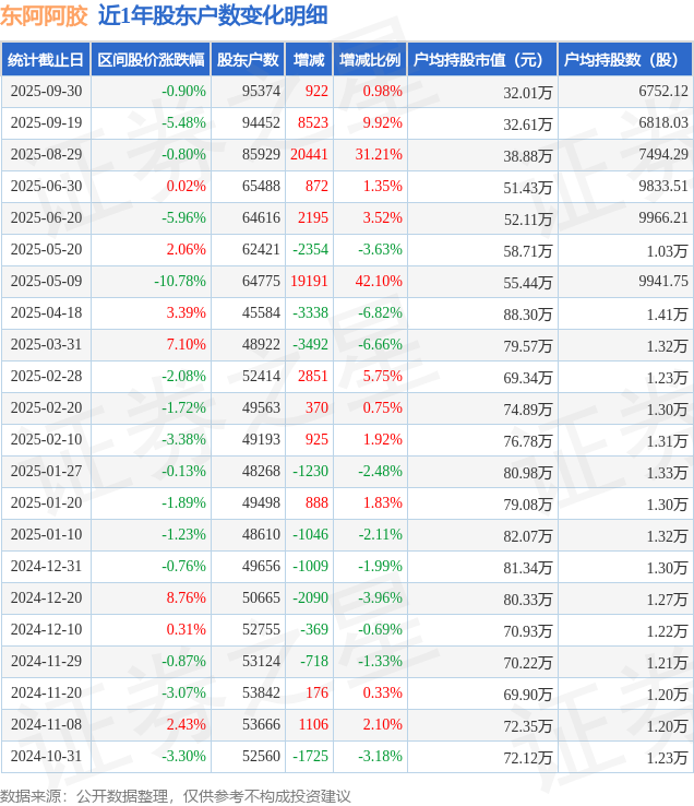 从股价来看,2025年9月19日至2025年9月30日,东阿阿胶区间跌幅为0.9%,在此期间股东户数增加922.0户,增幅为0.98%。
