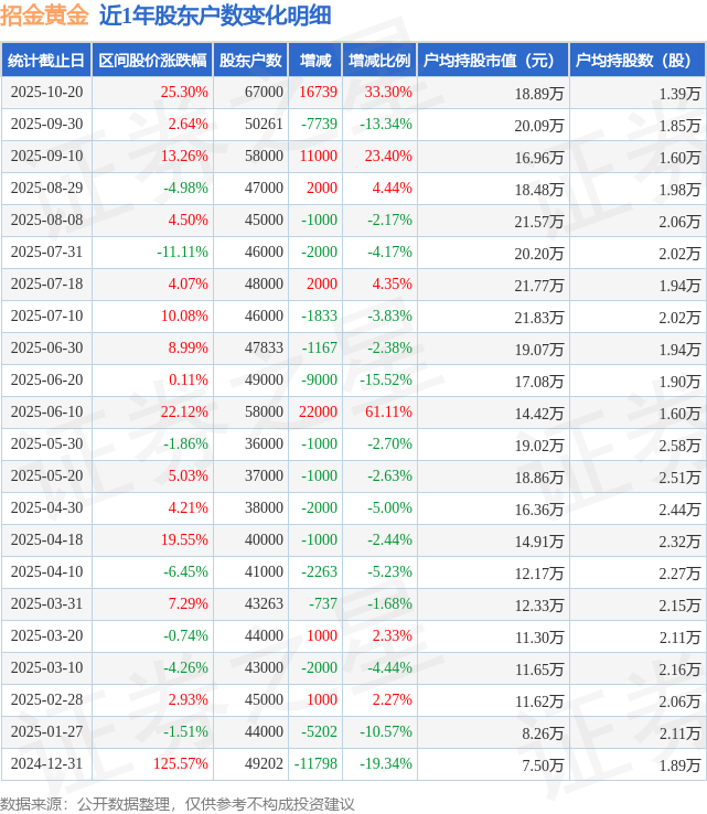 从股价来看,2025年9月30日至2025年10月20日,招金黄金区间涨幅为25.3%,在此期间股东户数增加1.67万户,增幅为33.3%。