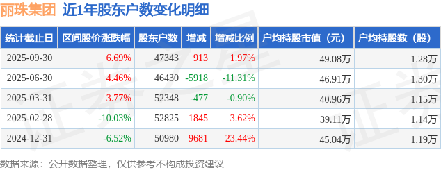 证券之星消息,近日丽珠集团披露,截至2025年9月30日公司股东户数为4.73万户,较6月30日增加913.0户,增幅为1.97%。户均持股数量由上期的1.3万股减少至1.28万股,户均持股市值为49.08万元。