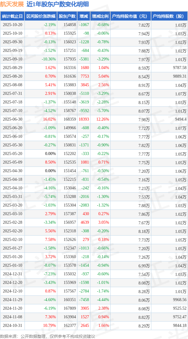从股价来看,2025年10月10日至2025年10月20日,航天发展区间跌幅为2.19%,在此期间股东户数减少1067.0户,减幅为0.68%。