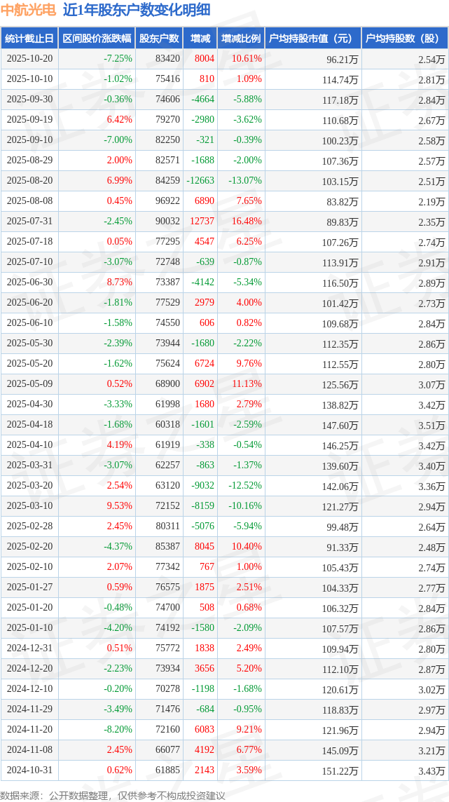 从股价来看,2025年10月10日至2025年10月20日,中航光电区间跌幅为7.25%,在此期间股东户数增加8004.0户,增幅为10.61%。