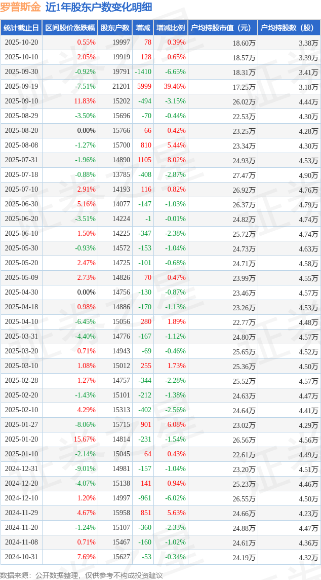 从股价来看,2025年10月10日至2025年10月20日,罗普斯金区间涨幅为0.55%,在此期间股东户数增加78.0户,增幅为0.39%。