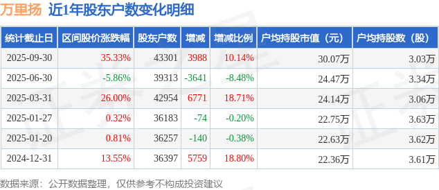 从股价来看,2025年6月30日至2025年9月30日,万里扬区间涨幅为35.33%,在此期间股东户数增加3988.0户,增幅为10.14%。