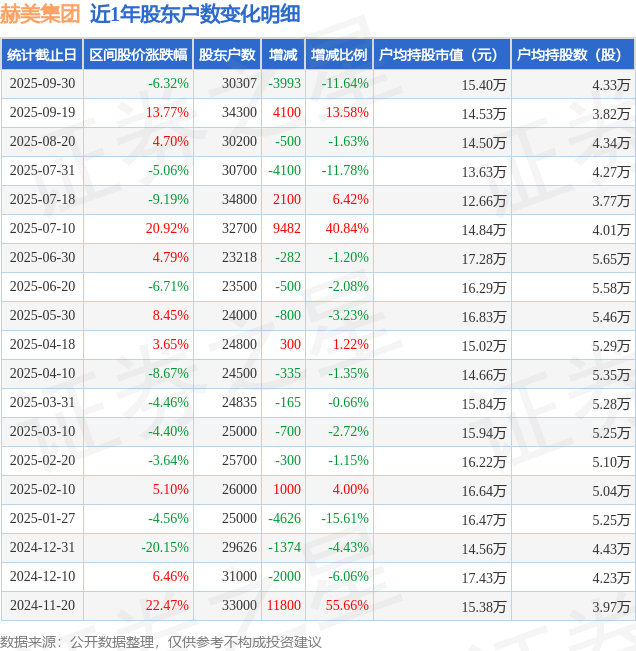 从股价来看,2025年9月19日至2025年9月30日,赫美集团区间跌幅为6.32%,在此期间股东户数减少3993.0户,减幅为11.64%。
