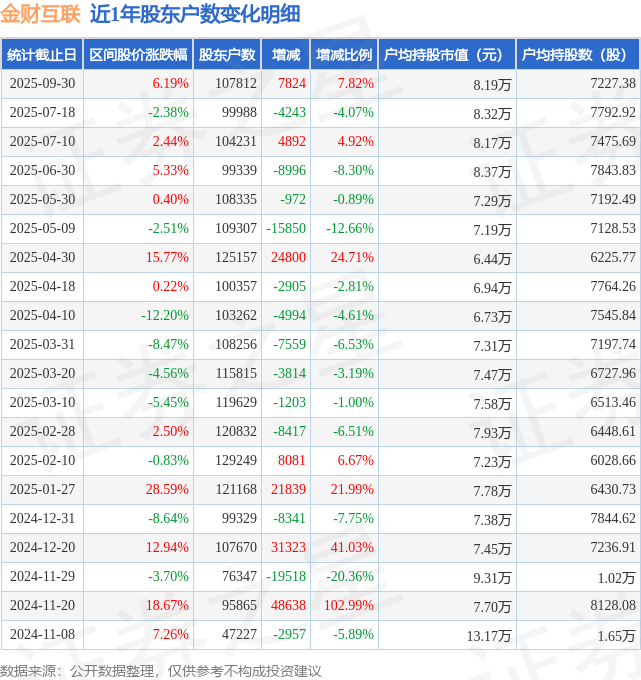 从股价来看,2025年7月18日至2025年9月30日,金财互联区间涨幅为6.19%,在此期间股东户数增加7824.0户,增幅为7.82%。