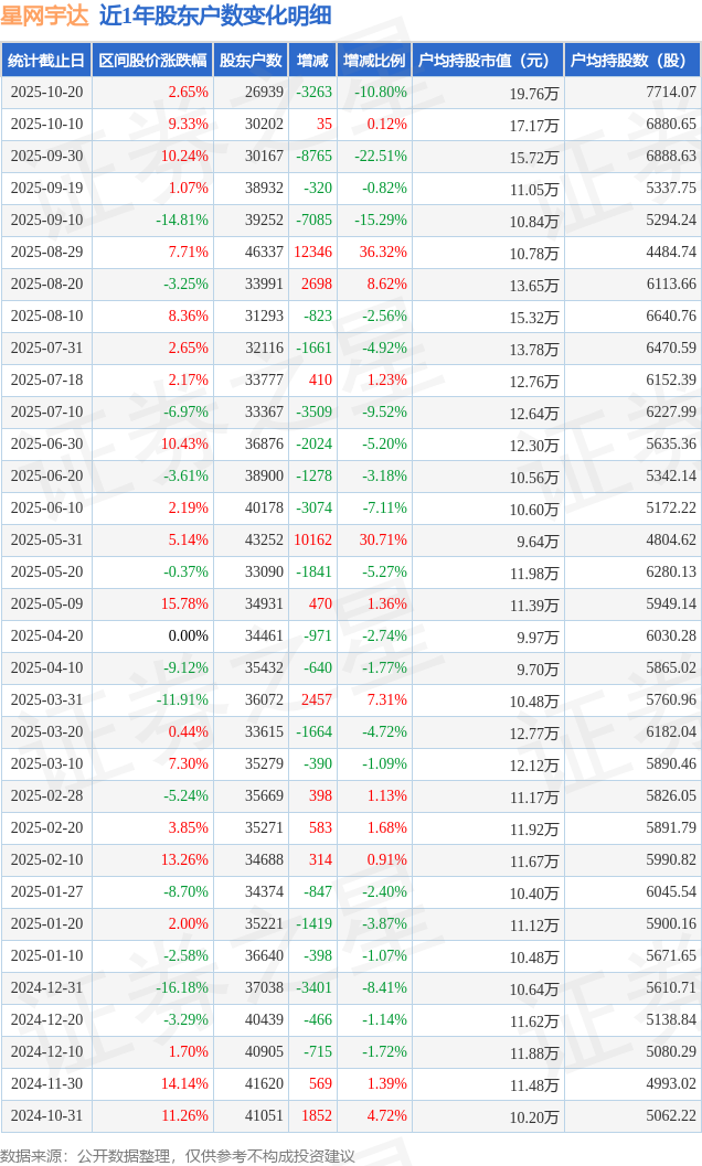 从股价来看,2025年10月10日至2025年10月20日,星网宇达区间涨幅为2.65%,在此期间股东户数减少3263.0户,减幅为10.8%。