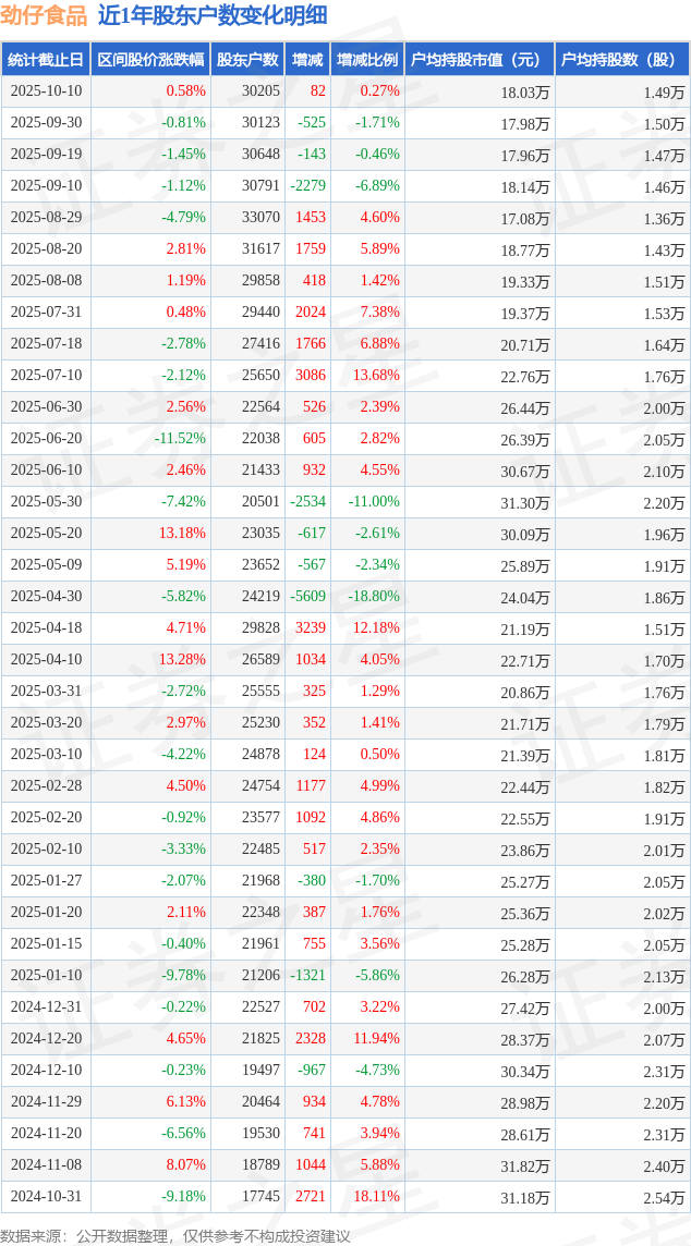 从股价来看,2025年9月30日至2025年10月10日,劲仔食品区间涨幅为0.58%,在此期间股东户数增加82.0户,增幅为0.27%。