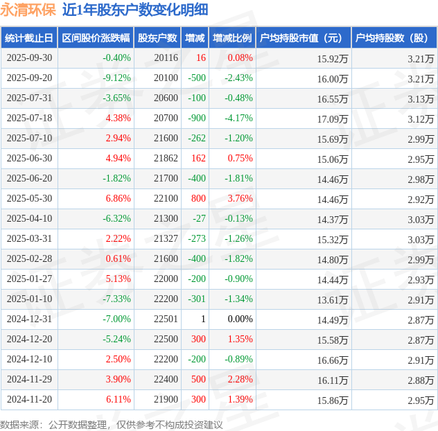 从股价来看,2025年9月20日至2025年9月30日,永清环保区间跌幅为0.4%,在此期间股东户数增加16.0户,增幅为0.08%。