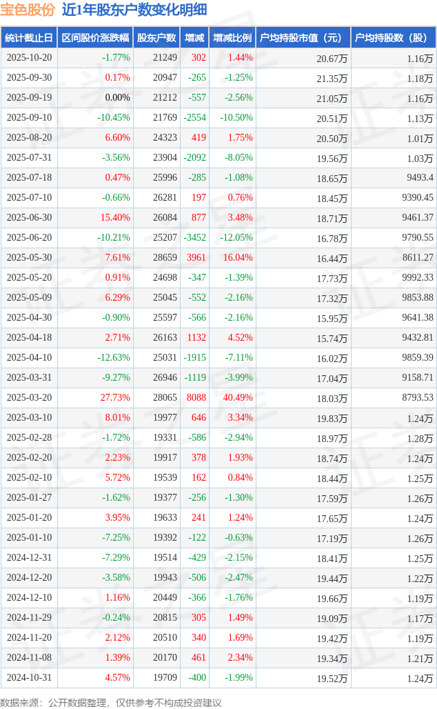 从股价来看,2025年9月30日至2025年10月20日,宝色股份区间跌幅为1.77%,在此期间股东户数增加63.0户,增幅为0.3%。