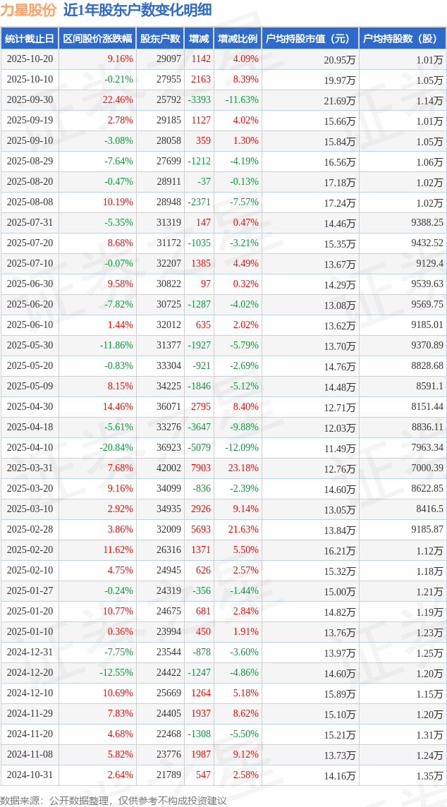 从股价来看,2025年10月10日至2025年10月20日,力星股份区间涨幅为9.16%,在此期间股东户数增加1142.0户,增幅为4.09%。