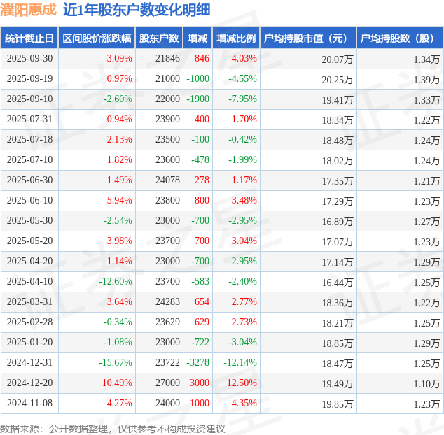 从股价来看,2025年9月19日至2025年9月30日,濮阳惠成区间涨幅为3.09%,在此期间股东户数增加846.0户,增幅为4.03%。