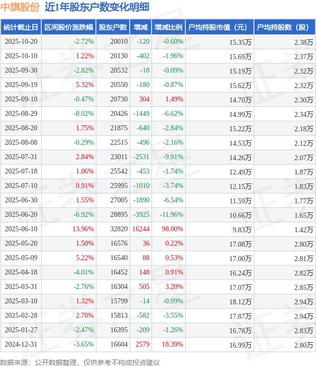 从股价来看,2025年10月10日至2025年10月20日,中旗股份区间跌幅为2.72%,在此期间股东户数减少120.0户,减幅为0.6%。