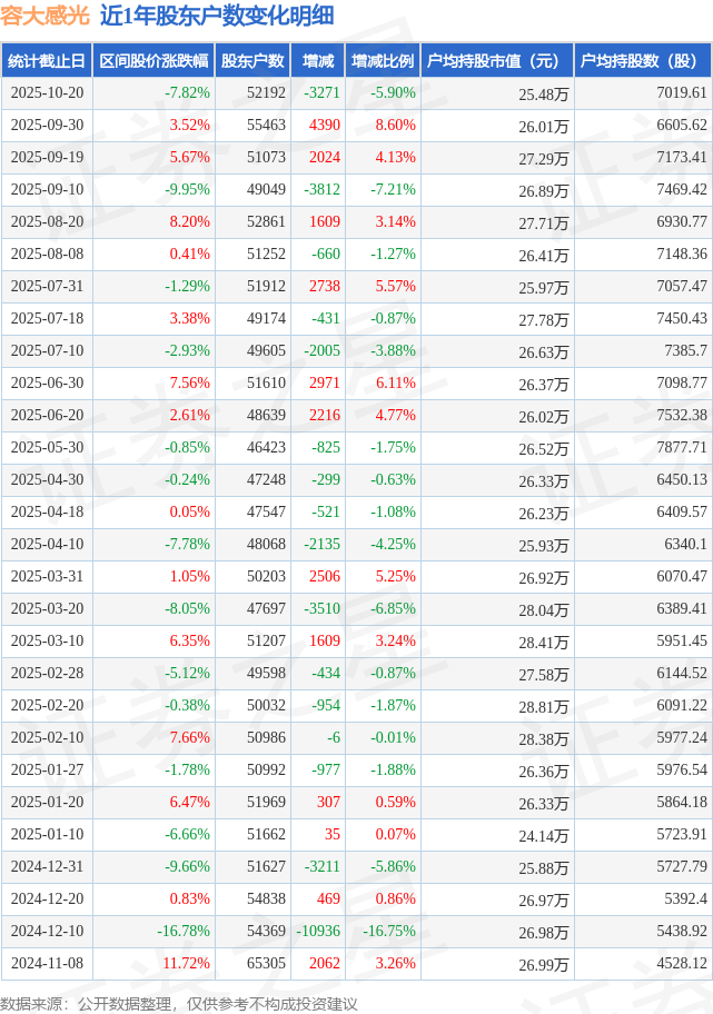 从股价来看,2025年9月30日至2025年10月20日,容大感光区间跌幅为7.82%,在此期间股东户数减少3271.0户,减幅为5.9%。