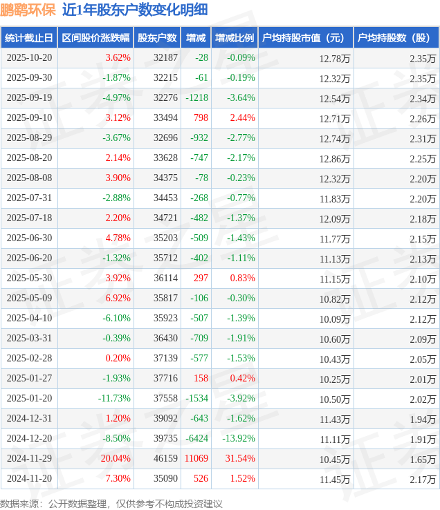 从股价来看,2025年9月30日至2025年10月20日,鹏鹞环保区间涨幅为3.62%,在此期间股东户数减少28.0户,减幅为0.09%。