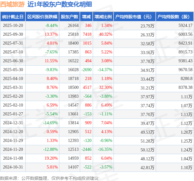 从股价来看,2025年9月30日至2025年10月20日,西域旅游区间跌幅为8.44%,在此期间股东户数增加346.0户,增幅为1.34%。