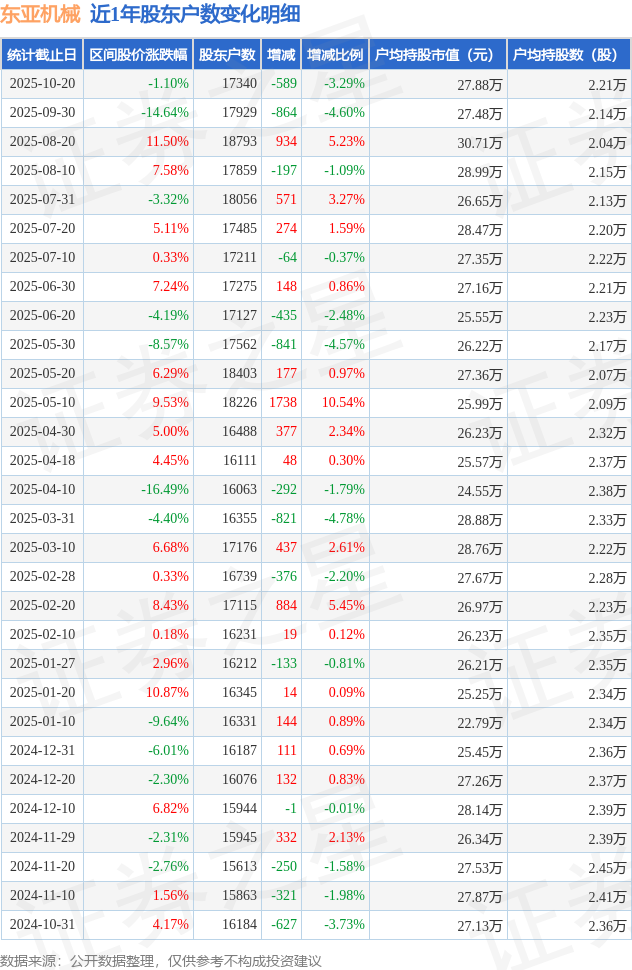 从股价来看,2025年9月30日至2025年10月20日,东亚机械区间跌幅为1.1%,在此期间股东户数减少589.0户,减幅为3.29%。