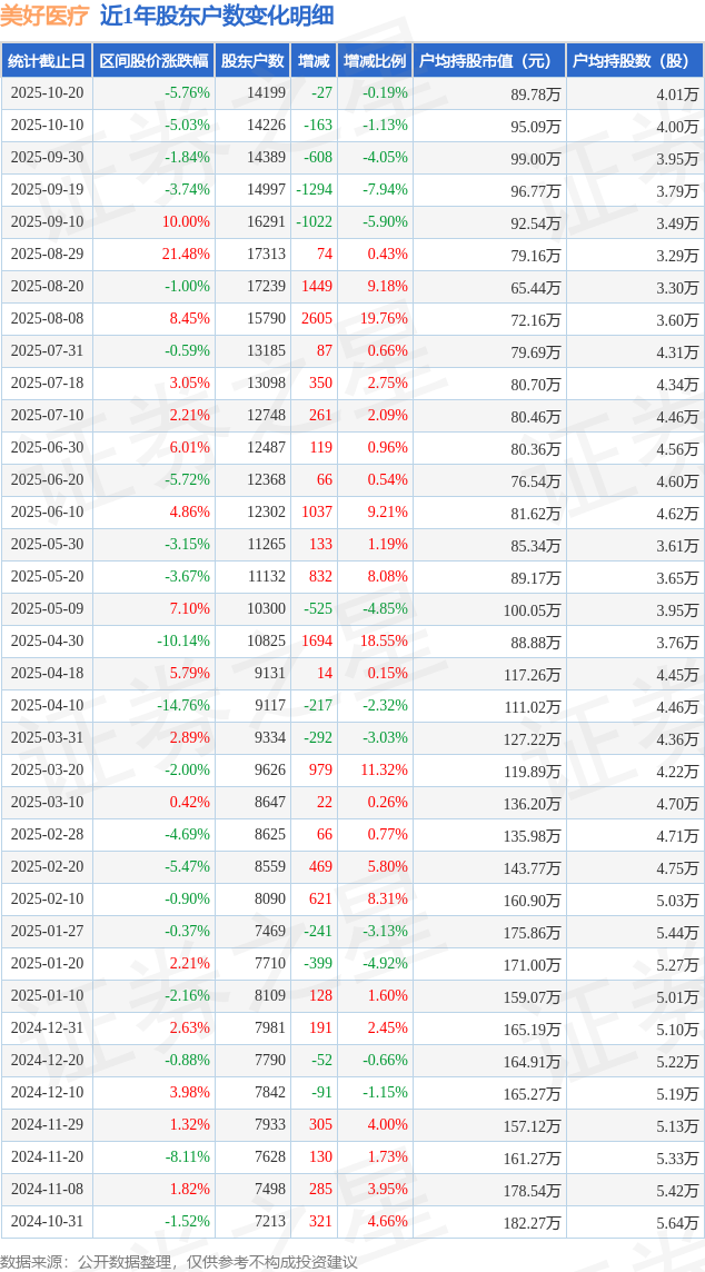 从股价来看,2025年10月10日至2025年10月20日,美好医疗区间跌幅为5.76%,在此期间股东户数减少27.0户,减幅为0.19%。