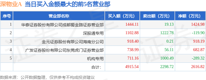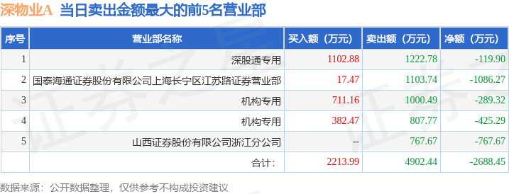 证券之星消息,沪深交易所2025年10月24日公布的交易公开信息显示,深物业A(000011)因日跌幅偏离值达到7%的前5只证券登上龙虎榜。此次是近5个交易日内第1次上榜。
