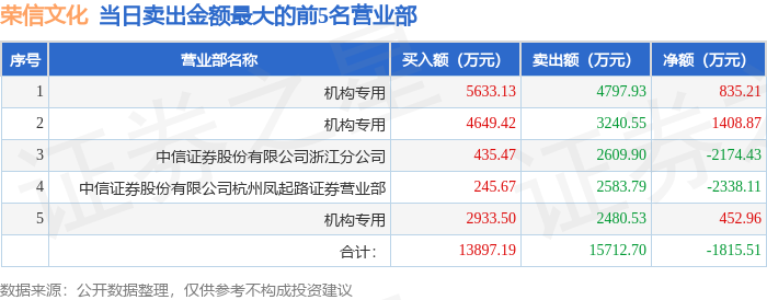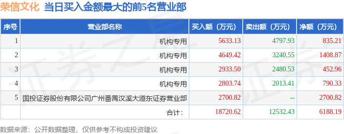证券之星消息,沪深交易所2025年10月24日公布的交易公开信息显示,荣信文化(301231)因日换手率达到30%的前5只证券登上龙虎榜。此次是近5个交易日内第4次上榜。