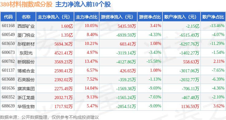 资金流向方面,380材料(000105)指数成份股当日主力资金净流入合计3.85亿元,游资资金净流出合计1.01亿元,散户资金净流出合计2.84亿元。成份股资金流向详情见下表: