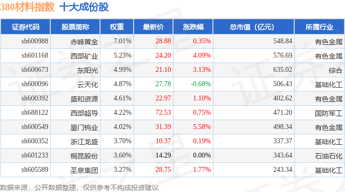 380材料(000105)指数十大成份股详情如下: