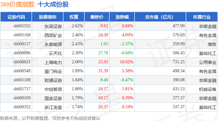 证券之星消息,10月24日,380价值(000118)指数报收于10025.26点,跌0.03%,成交421.86亿元,换手率1.52%。当日该指数成份股中,上涨的有34家,上海电力以10.02%的涨幅领涨,下跌的有81家,深圳燃气以4.08%的跌幅领跌。