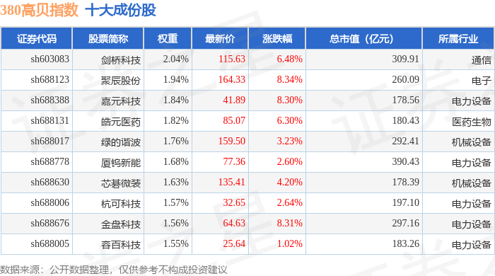 证券之星消息,10月24日,380高贝(000137)指数报收于5893.02点,涨2.65%,成交605.36亿元,换手率2.49%。当日该指数成份股中,上涨的有83家,聚辰股份以8.34%的涨幅领涨,下跌的有17家,南网科技以2.33%的跌幅领跌。