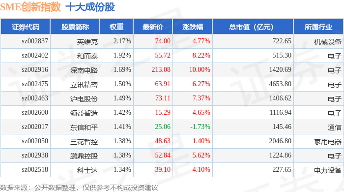 证券之星消息,10月24日,SME创新(399017)指数报收于4859.1点,涨2.44%,成交1314.63亿元,换手率3.01%。当日该指数成份股中,上涨的有81家,深南电路以10.0%的涨幅领涨,下跌的有18家,理工能科以2.92%的跌幅领跌。