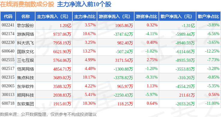 资金流向方面,在线消费(399361)指数成份股当日主力资金净流出合计6.16亿元,游资资金净流出合计617.04万元,散户资金净流入合计6.22亿元。成份股资金流向详情见下表: