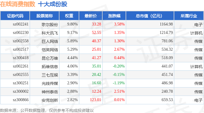 证券之星消息,10月24日,在线消费(399361)指数报收于3940.74点,涨0.87%,成交294.86亿元,换手率2.41%。当日该指数成份股中,上涨的有34家,游族网络以5.15%的涨幅领涨,下跌的有15家,天下秀以3.28%的跌幅领跌。