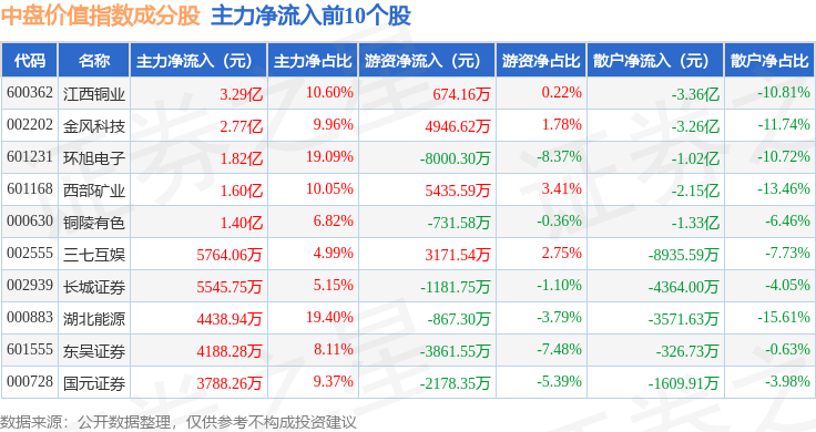 资金流向方面,中盘价值(399375)指数成份股当日主力资金净流入合计1.3亿元,游资资金净流入合计5.87亿元,散户资金净流出合计7.17亿元。成份股资金流向详情见下表: