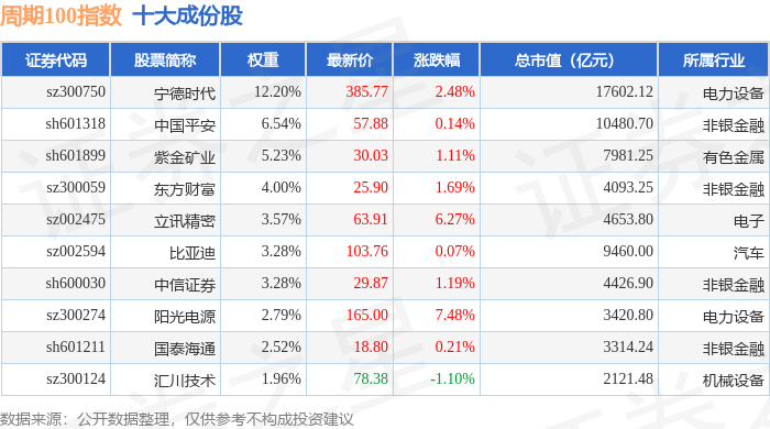 周期100(399402)指数十大成份股详情如下: