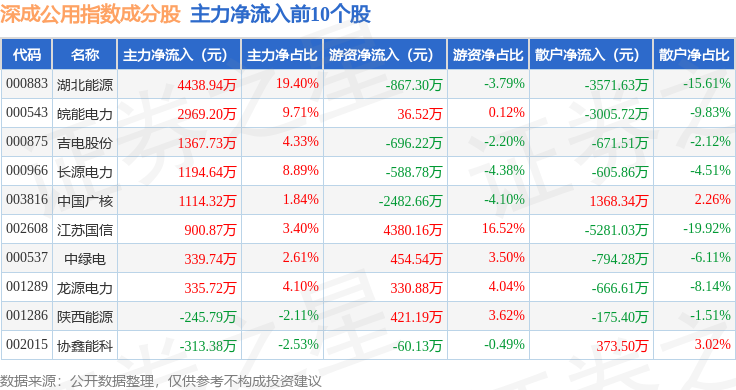 资金流向方面,深成公用(399689)指数成份股当日主力资金净流入合计2105.21万元,游资资金净流入合计8647.68万元,散户资金净流出合计1.08亿元。成份股资金流向详情见下表:
