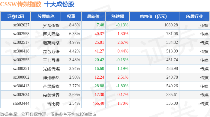 证券之星消息,10月24日,CSSW传媒(399810)指数报收于3047.6点,涨0.25%,成交316.28亿元,换手率2.26%。当日该指数成份股中,上涨的有42家,游族网络以5.15%的涨幅领涨,下跌的有53家,海看股份以9.46%的跌幅领跌。