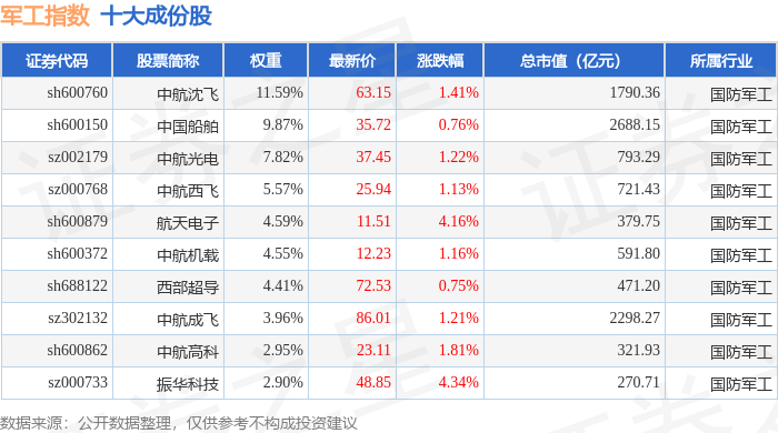 证券之星消息,10月24日,军工指数(399959)报收于1616.51点,涨1.89%,成交230.06亿元,换手率1.84%。当日该指数成份股中,上涨的有38家,航天智装以19.98%的涨幅领涨,下跌的有2家,臻镭科技以3.24%的跌幅领跌。