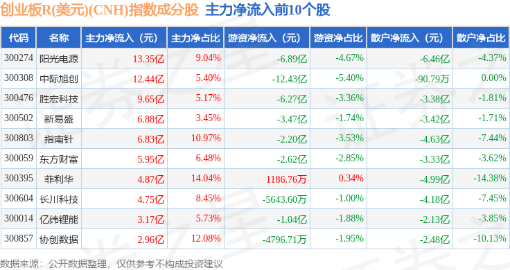 资金流向方面,创业板R(美元)(CNH)(470007)指数成份股当日主力资金净流入合计85.67亿元,游资资金净流出合计35.95亿元,散户资金净流出合计49.72亿元。成份股资金流向详情见下表: