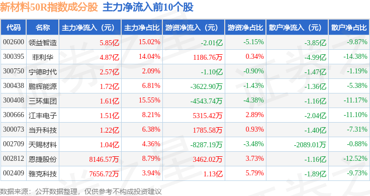资金流向方面,新材料50R(470042)指数成份股当日主力资金净流入合计14.49亿元,游资资金净流出合计1.72亿元,散户资金净流出合计12.77亿元。成份股资金流向详情见下表: