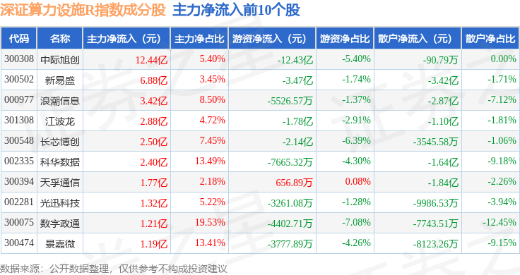 资金流向方面,深证算力设施R(470051)指数成份股当日主力资金净流入合计22.64亿元,游资资金净流出合计20.95亿元,散户资金净流出合计1.7亿元。成份股资金流向详情见下表: