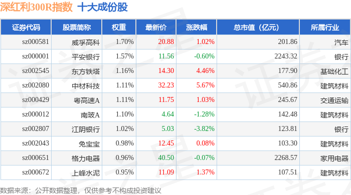 证券之星消息,10月24日,深红利300R(470062)指数报收于8061.46点,涨0.22%,成交1973.26亿元,换手率1.86%。当日该指数成份股中,上涨的有155家,宏达电子以10.07%的涨幅领涨,下跌的有142家,深粮控股以6.42%的跌幅领跌。