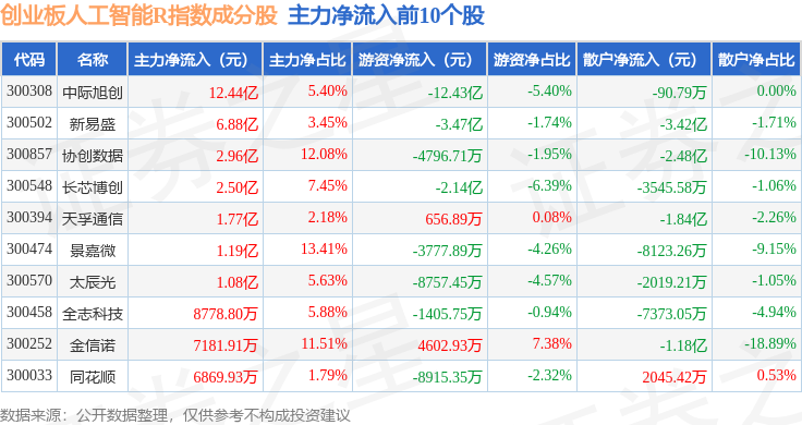 资金流向方面,创业板人工智能R(470070)指数成份股当日主力资金净流入合计23.82亿元,游资资金净流出合计18.58亿元,散户资金净流出合计5.24亿元。成份股资金流向详情见下表:
